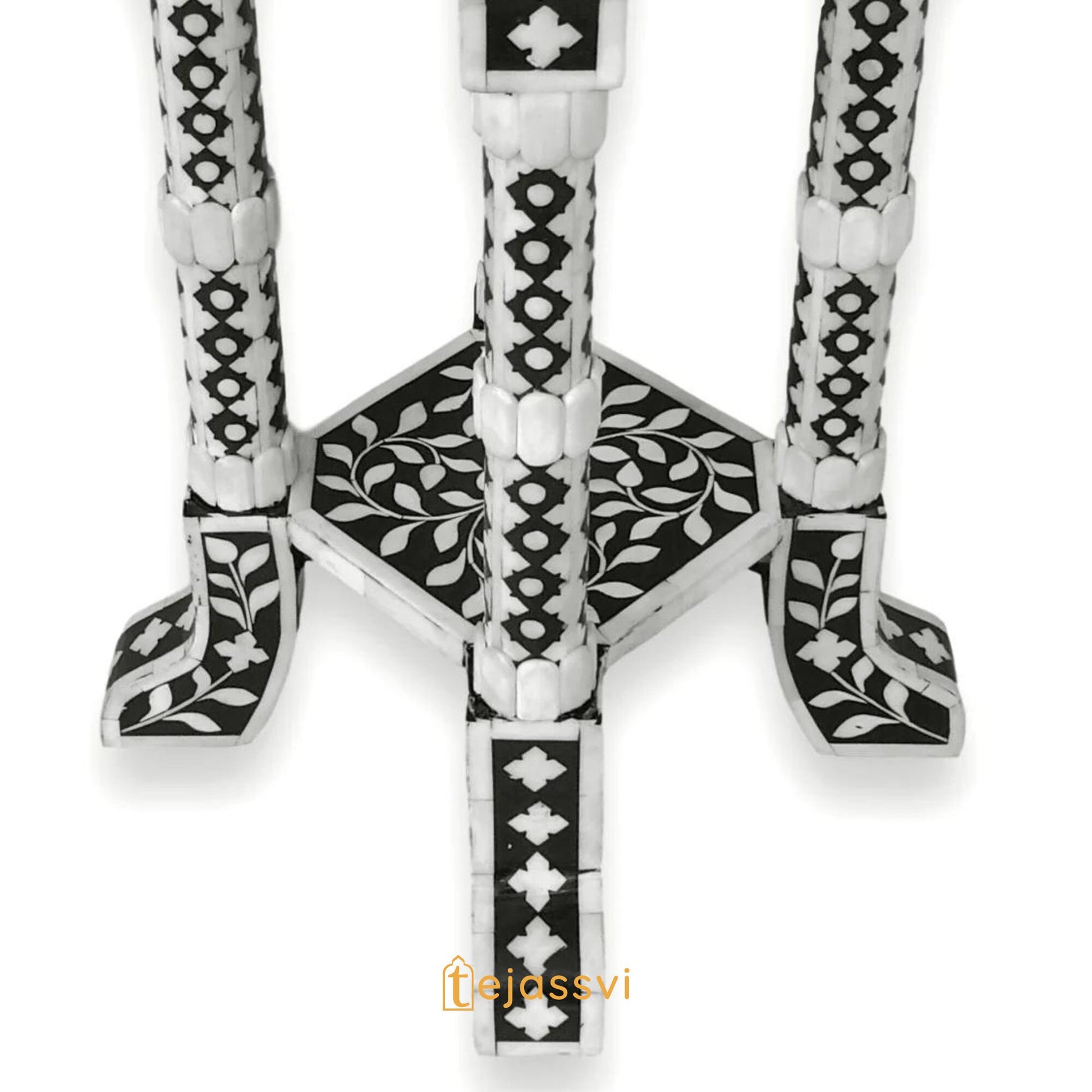 Introducing our Floral Bone Inlay Black & White 12-inch Accent Table, a statement piece for your living room. With meticulous craftsmanship, this end table not only serves as a functional accent but also exudes modern luxury. Elevate your space with its striking design, blending timeless beauty with contemporary flair.