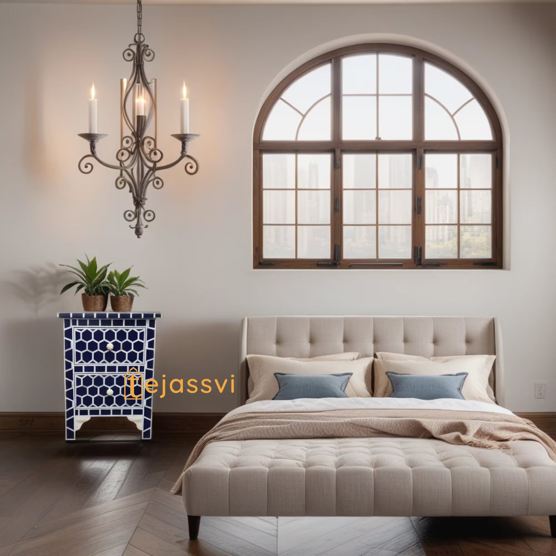 Elevate your space with Unique Solutioncrafts' one-of-a-kind 2 Drawer bedside table, featuring a captivating bone inlay design. The monochrome hues and geometric patterns add a unique charm while providing practical storage with a combination of drawers and a cabinet. Handcrafted by skilled Indian artisans, each piece is a work of precision, starting with a wooden base and ethically sourced bone chips. Meticulously arranged in intricate patterns, the inlay work is waxed and polished to reveal its detailed textures. Embrace the individuality of each item, as no two pieces are alike, making these treasures a perfect blend of artistry and functionality