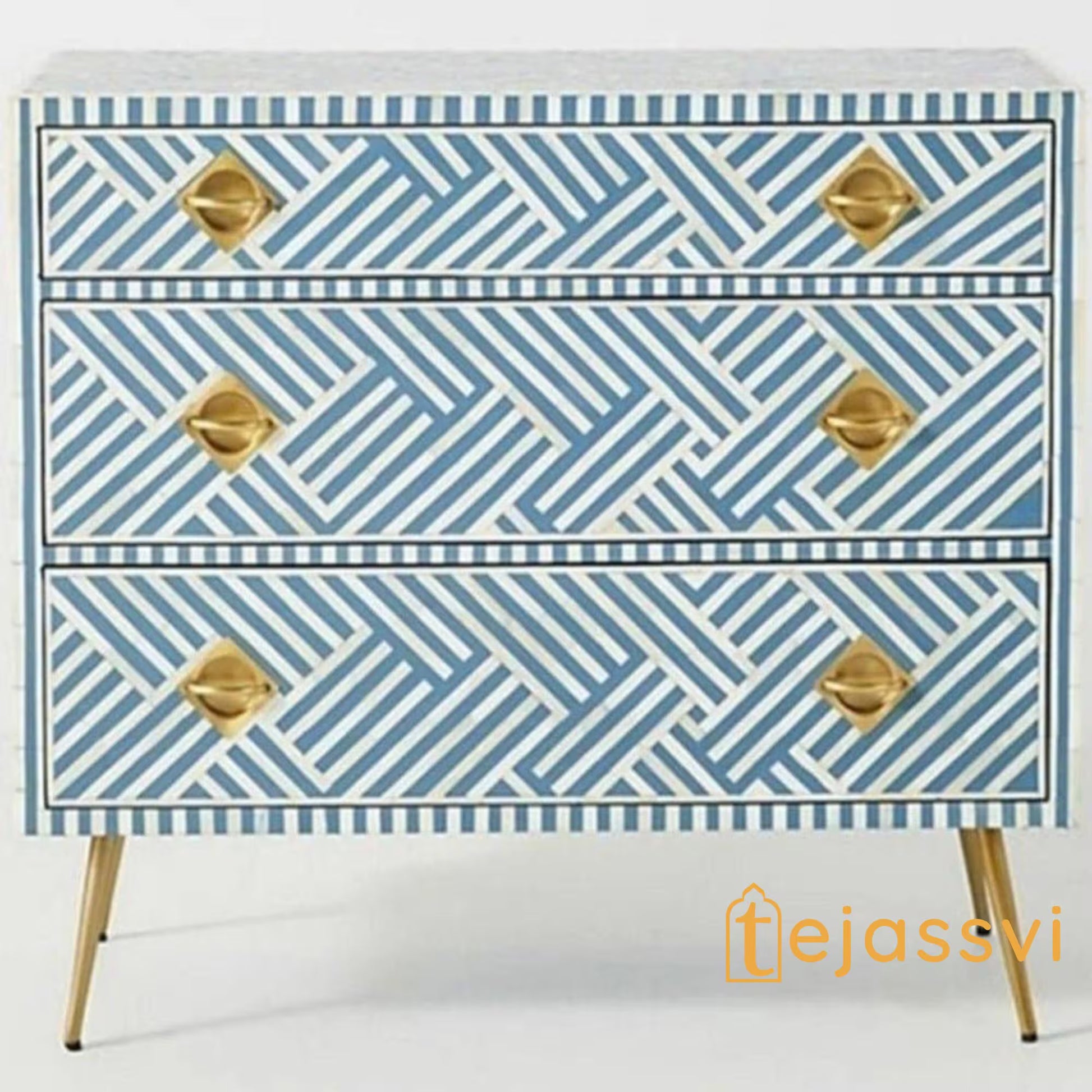 Wooden Bone Inlay Chest of 3 Drawers stripe Blue with Brass Legs, Bone Inlay Dresser, Bone Inlay Sideboard, Bone Inlay Furniture, Optical Cabinet.