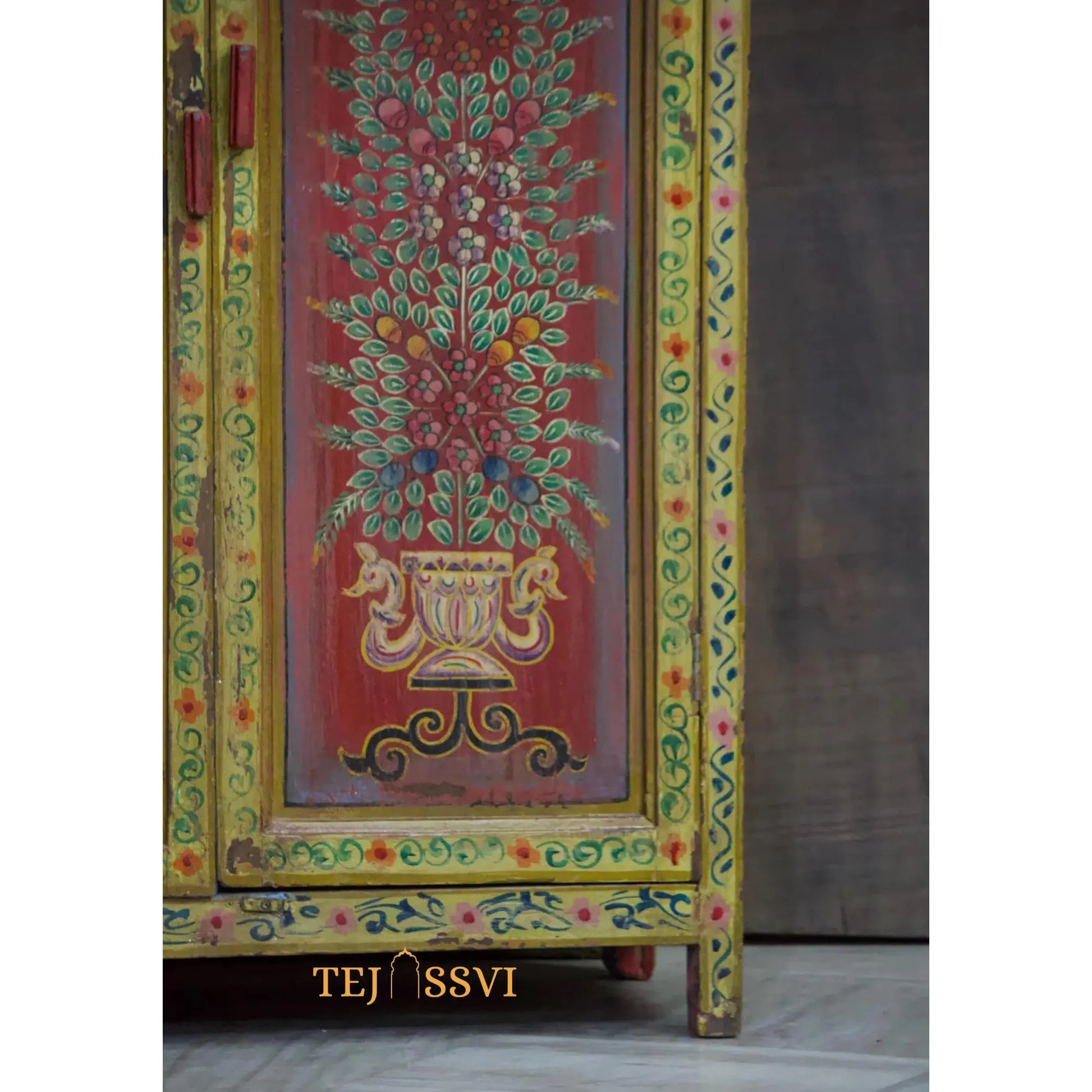 Add a touch of timeless elegance to your home with this stunning vintage wooden cabinet. Hand-painted with intricate floral patterns in vibrant red, green, white, and yellow, this cabinet is a true work of art. Perfect for rustic or eclectic interiors, it offers both beauty and functionality. Use it to store your essentials while enhancing your decor with its unique charm. Ideal for living rooms, bedrooms, or entryways, this cabinet is sure to be a conversation starter. Enhance your living space with this unique and beautifully aged storage solution.