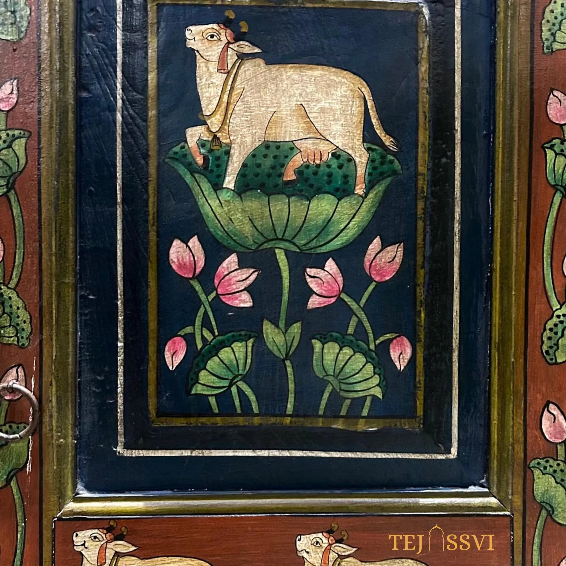 Step into the realm of timeless elegance with this Antique Hand-Painted Wooden Indian Ethnic Cabinet. Crafted with artisanal finesse, this vintage wooden sideboard exudes rustic charm, adding an exquisite touch to your home décor. Each intricate brushstroke tells a story of tradition and craftsmanship, symbolizing the cultural richness of India. The cabinet features a sacred Indian holy cow delicately painted with a floral design, making it a unique piece that blends artistry and functionality seamlessly. Perfect for your entryway or as a storage cupboard, this handmade masterpiece is a celebration of heritage and style, inviting warmth and character into your living space. Ideal for collectors of unique furniture or anyone looking to infuse their living space with the warmth of countryside allure..