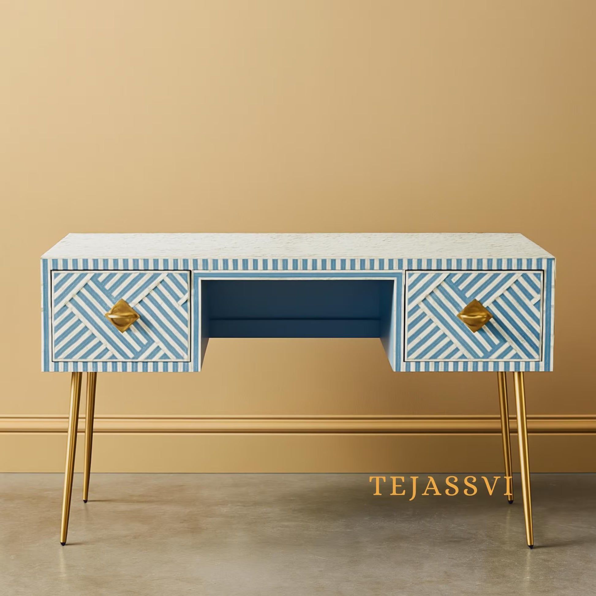Bone inlay Work Desk | laptop table | console table, Bone Inlay Optical Design 2 Drawers Desk Sky Blue, Optical Design Study wooden Table.