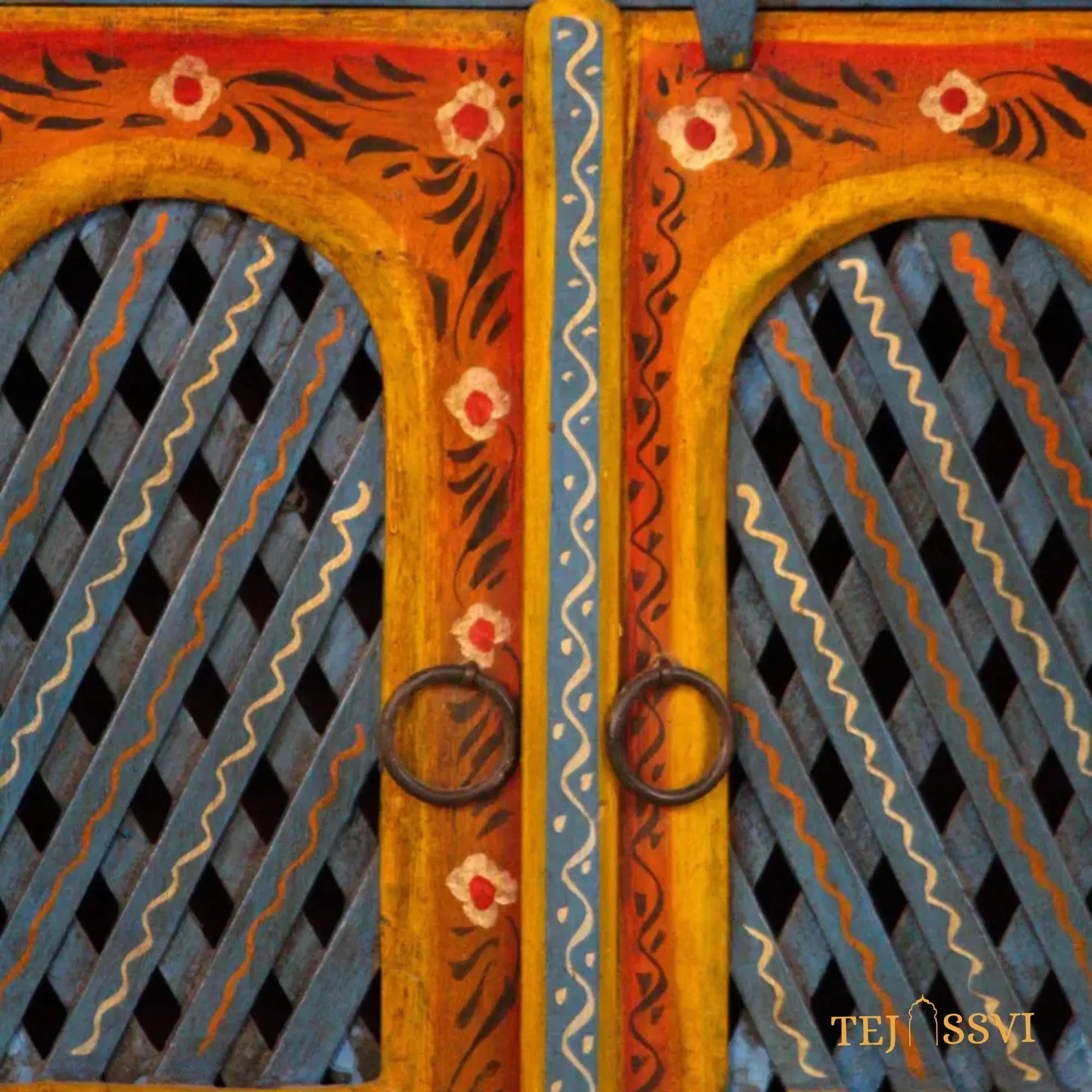 Our hand-painted Vintage cabinet in rich red is elaborately embellished with traditional Indian floral designs and eye-catching embossing. With the look of an antique, it features generous inside space, detailed doors and two drawers.