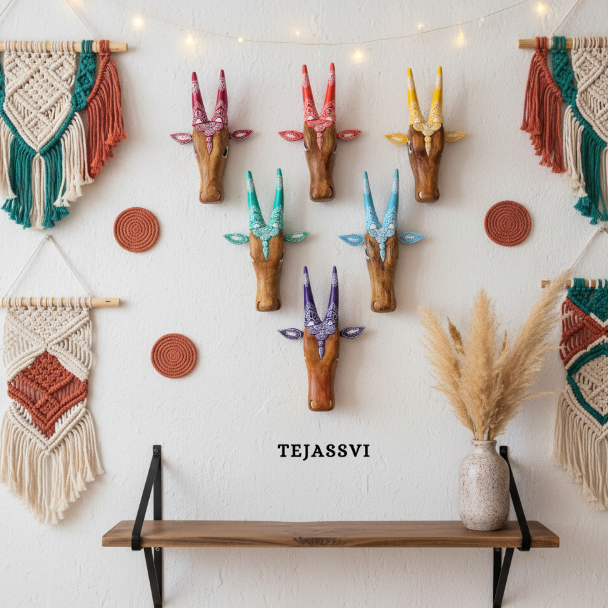 SET of 6 Wooden Painted Cow Head 16 Inches | Bull | Nandi Head Mask Wall Décor. Wooden Wall Hanging. Ethnic Indian Art.