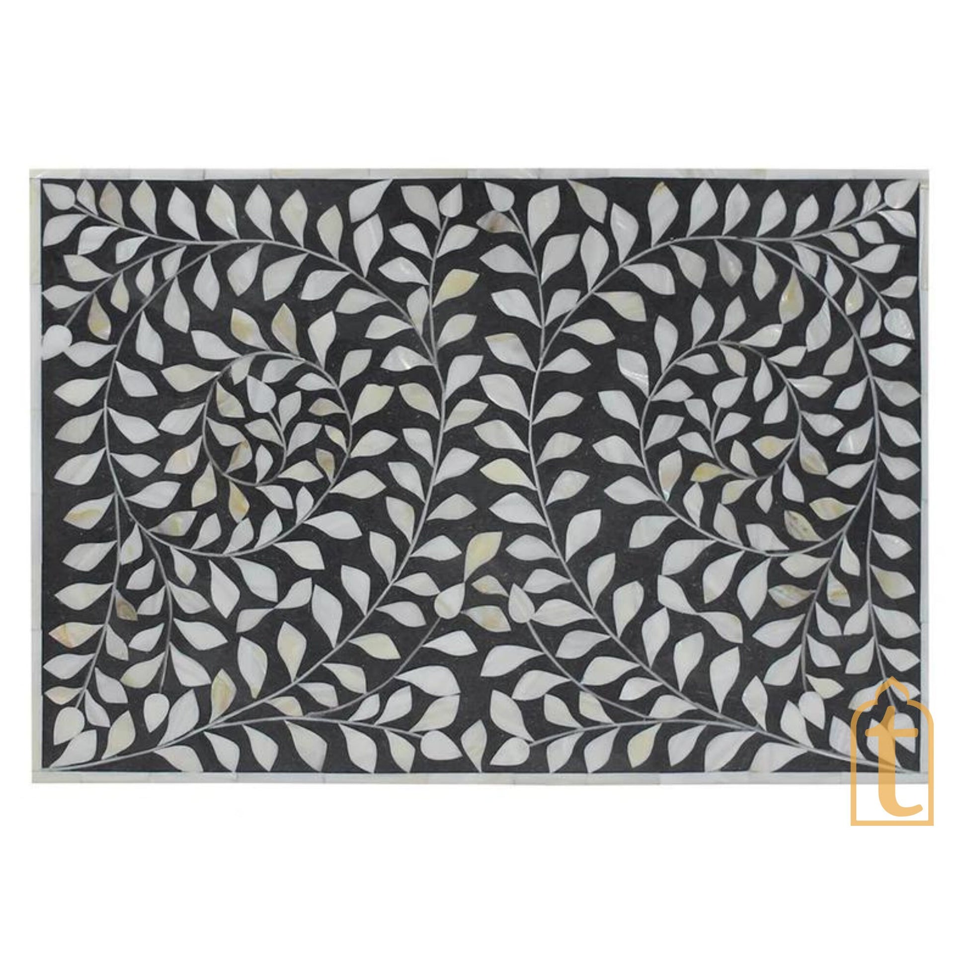 All of our Items are entirely made by hand and is handcrafted by skilled artisans native to India. The process starts with building a wooden base for the any items, Chips of bone, ethically sourced as a by-product, are carefully cut into delicate shapes by several artisans. These chips are then affixed in various intricate patterns onto the resin, all by hand. Each Product is finally waxed and polished to bring out the detailed textures and beauty of the inlay work.