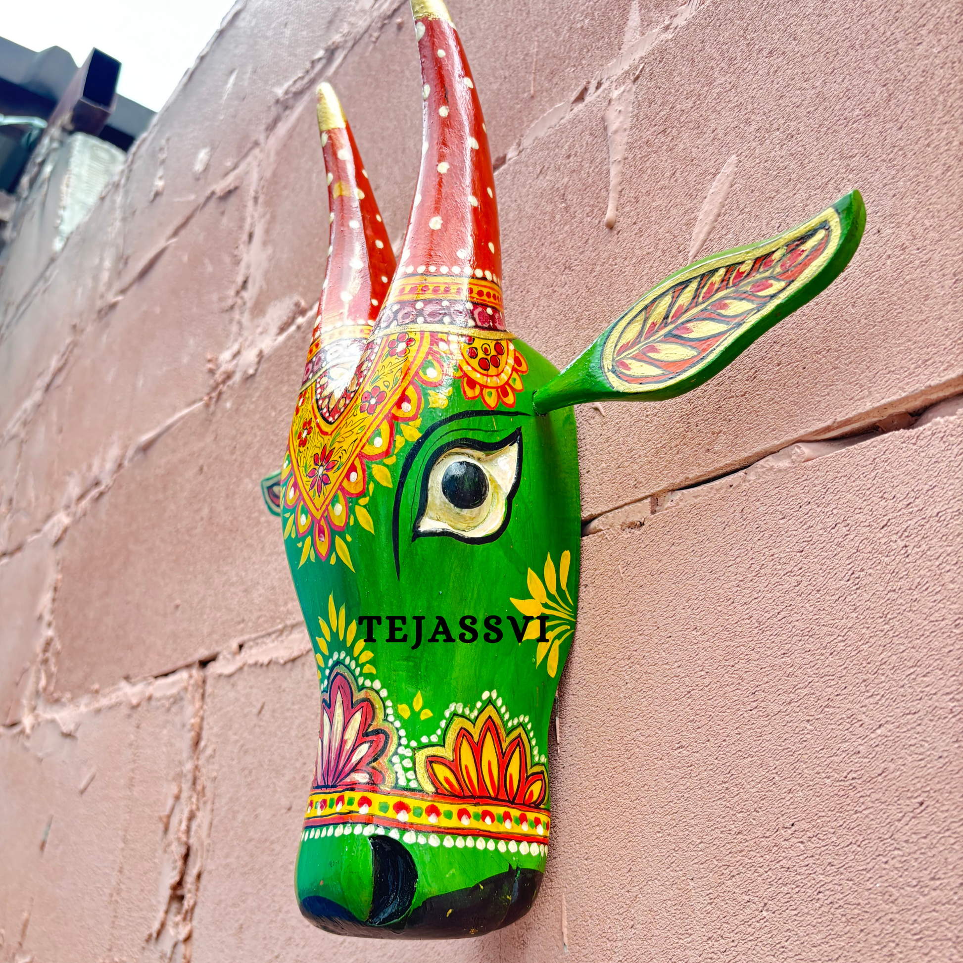 Awesomely beautiful 16 Inch long artifact Wooden Cow | Bull | Nandi head to decorate your home/office. Exclusively handcrafted and hand-painted. Comes with a necessary hook for the back foot wall hanging purposes. Ears are made detachable for packing and shipping purposes.